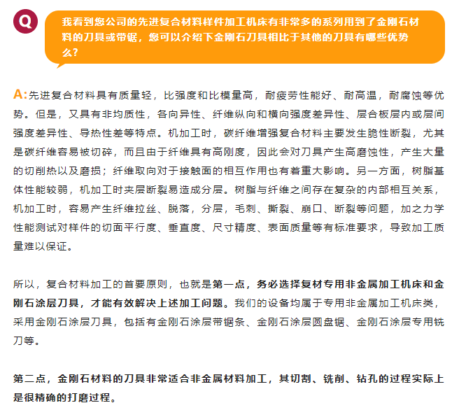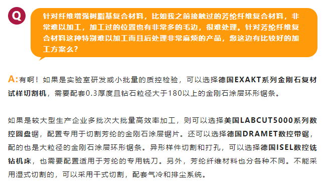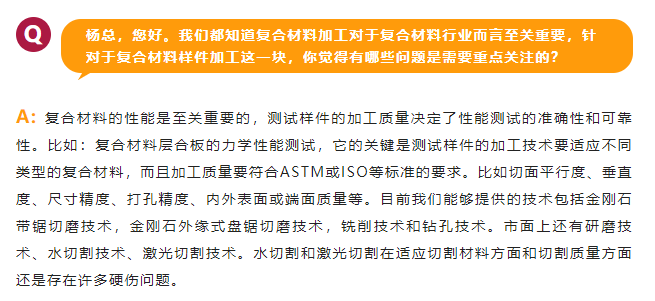 要解決好這些問題,首先是針對(duì)加工材料來選擇什么樣的技術(shù)和設(shè)備,才能適應(yīng)復(fù)材力學(xué)性能測(cè)試需要的矩形樣件,包括增強(qiáng)件的加工,薄切片,或各種異形樣件加工、打孔;其次是固定樣件加工時(shí)不移位,并且要選擇適合對(duì)應(yīng)的切割刀具和工藝來保證切割質(zhì)量,如矩形樣件切割時(shí),復(fù)材板基準(zhǔn)邊的零點(diǎn)定位切割很關(guān)鍵;第三是對(duì)于大型生產(chǎn)企業(yè)的復(fù)合材料質(zhì)控檢驗(yàn),如何解決多批次大批量且又符合ASTM標(biāo)準(zhǔn)的高效率加工問題;第四是切割軟性和硬質(zhì)復(fù)合(或鑲嵌)的材料,選擇進(jìn)給力的方式很關(guān)鍵,否則很容易損傷軟硬材料之間的結(jié)合面;第五是要根據(jù)用戶用于研發(fā)還是質(zhì)控檢驗(yàn)的目的,來為用戶提供性價(jià)比合適的技術(shù)解決方案。