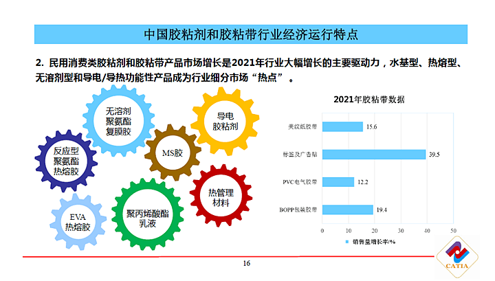 中國膠粘劑和膠粘帶工業(yè)協(xié)會秘書長楊栩介紹了中國膠粘劑和膠粘帶行業(yè)的市場現(xiàn)狀,發(fā)布了行業(yè)各品種的最新統(tǒng)計數(shù)據(jù),系統(tǒng)梳理了膠粘劑和膠粘帶相關政策和環(huán)境變化,并分享了2021年以來行業(yè)經濟運行的十大特點,以及行業(yè)未來的八大展望。
