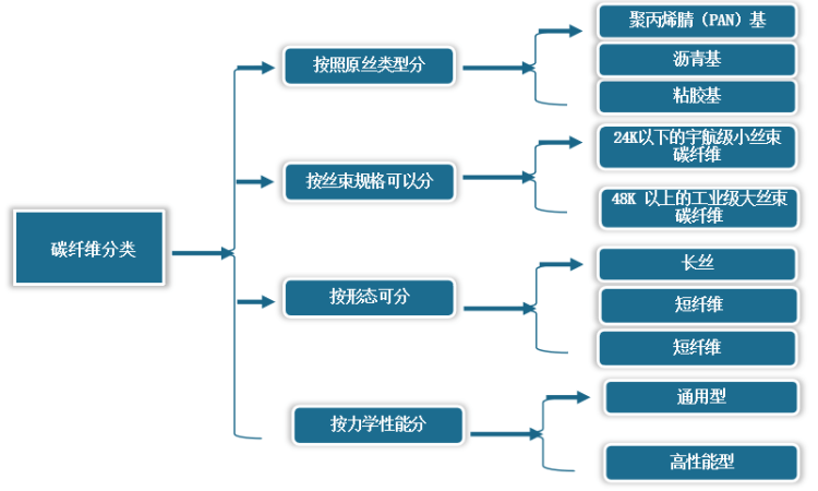 碳纖維按照原絲類型分為聚丙烯腈(PAN)基、瀝青基和粘膠基,按絲束規(guī)格可以分為24K以下的宇航級(jí)小絲束碳纖維(1K的含義為一條碳纖維絲束 含 1000 根單絲)和 48K 以上的工業(yè)級(jí)大絲束碳纖維,按形態(tài)可分為長(zhǎng)絲、短纖維和短切纖維,按力學(xué)性能分為通用型和高性能型。其中基碳纖維綜合性能最好、生產(chǎn)工藝成熟簡(jiǎn)單、應(yīng)用最廣、產(chǎn)量最高、品種最多,是目前全球碳纖維市場(chǎng)的主流碳纖維產(chǎn)品,產(chǎn)量占全球碳纖維總產(chǎn)量的90%以上。