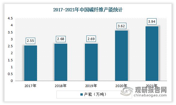 隨著我國(guó)碳纖維行業(yè)相關(guān)技術(shù)不斷提升,在自主研發(fā)方面不斷突破,使得2017-2021年我國(guó)碳纖維產(chǎn)能不斷加大。數(shù)據(jù)顯示,2021年我國(guó)碳纖維產(chǎn)能從2017年的2.55萬(wàn)噸增長(zhǎng)至3.94萬(wàn)噸。