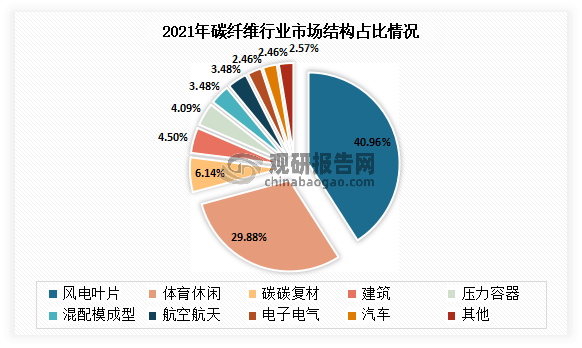 碳纖維是一種應(yīng)用前景十分廣闊的戰(zhàn)略性新材料,目前廣泛應(yīng)用于航空航天、海洋工程、新能源裝備、工程機(jī)械、交通設(shè)施等領(lǐng)域。其中風(fēng)電葉片是主要應(yīng)用領(lǐng)域,占比達(dá)到了40.96%;其次為體育領(lǐng)域,占比為29.88%。
