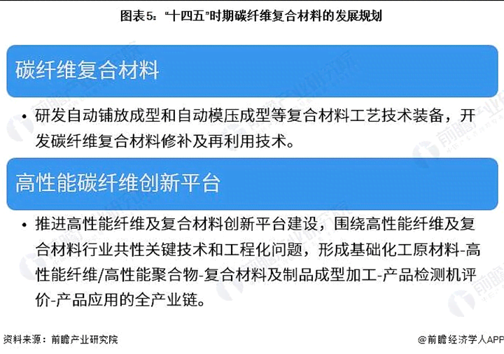 根據(jù)《化纖工業(yè)高質(zhì)量發(fā)展的指導(dǎo)意見(jiàn)》,“十四五”時(shí)期,提高碳纖維、芳綸、超高分子量聚乙烯纖維、聚酰亞胺纖維、聚苯硫醚纖維、聚四氟乙烯纖維、連續(xù)玄武巖纖維的生產(chǎn)與應(yīng)用水平,提升高性能纖維質(zhì)量一致性和批次穩(wěn)定性。進(jìn)一步擴(kuò)大高性能纖維在航空航天、風(fēng)力和光伏發(fā)電、海洋工程、環(huán)境保護(hù)、安全防護(hù)、土工建筑、交通運(yùn)輸?shù)阮I(lǐng)域應(yīng)用。具體碳纖維復(fù)合材料行業(yè)規(guī)劃圍繞碳纖維復(fù)合材料以及高性能纖維創(chuàng)新平臺(tái)展開(kāi)。