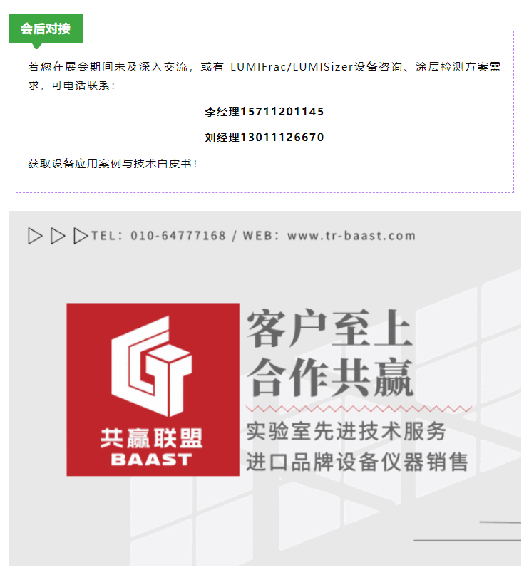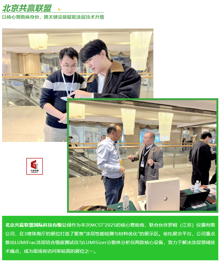 本次 MCST'2025的參與,不僅讓北京共贏聯(lián)盟的 LUMIFrac 與 LUMISizer設(shè)備獲得行業(yè)深度認(rèn)可,更通過(guò)與高校、企業(yè)的面對(duì)面交流,精準(zhǔn)捕捉到涂層領(lǐng)域的新需求——如“低溫涂層結(jié)合強(qiáng)度檢測(cè)”“生物醫(yī)用涂層安全性評(píng)估”等,為后續(xù)設(shè)備技術(shù)迭代與服務(wù)優(yōu)化提供方向。