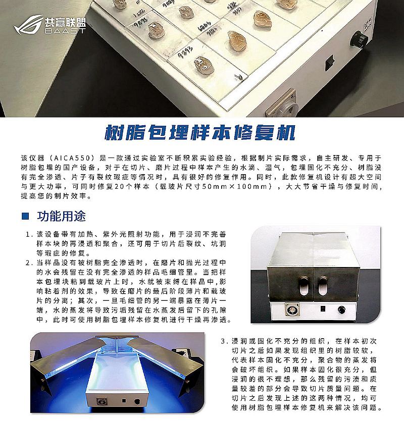 該儀器(AICA550)是一款通過(guò)實(shí)驗(yàn)室不斷積累實(shí)驗(yàn)經(jīng)驗(yàn),根據(jù)制片實(shí)際需求,自主研發(fā)、專(zhuān)用于樹(shù)脂包埋的國(guó)產(chǎn)設(shè)備,對(duì)于在切片、磨片過(guò)程中樣本產(chǎn)生的水滴、濕氣,包埋固化不充分、樹(shù)脂沒(méi)有完全滲透、片子有裂紋瑕疵等情況時(shí),具有很好的修復(fù)作用。同時(shí),此款修復(fù)機(jī)設(shè)計(jì)有超大空間與更大功率,可同時(shí)修復(fù)20個(gè)樣本(載玻片尺寸50mm*100mm),大大節(jié)省干燥與修復(fù)時(shí)間,提高您的制片效率。