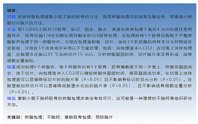 [14]王勇平, 李曉琴, 張輝, 等. 塑料包埋結(jié)合四環(huán)素?zé)晒鈽?biāo)記制作不脫鈣骨組織切片的實(shí)驗(yàn)研究[J]. 臨床與實(shí)驗(yàn)病理學(xué)雜志, 2012, 28(5):543-5.