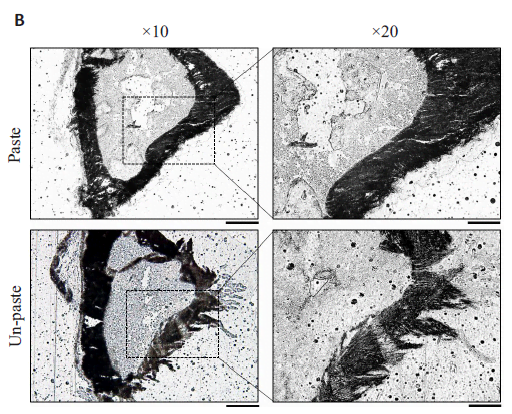 A: Representative scan pictures of Paste and Un-paste slides(scale bar=1 mm); B: Representative unstained paste and non-paste slides under microscope (left panel: scale bar=200 μm; right panel: scale bar=100 μm); C: Representative fluorescent pictures of paste and non-paste slides (left panel: scale bar=100 μm; right panel: scale bar=50 μm); D: Number of effective slides and rate of slides detachment in paste and non-paste groups (***P<0.001, n=6); E: Mineral apposition rate (MAR, μm/d) and bone formation rate (BFR/BS, %/d) in paste and non-paste groups (n.s: P>0.05, n=12).