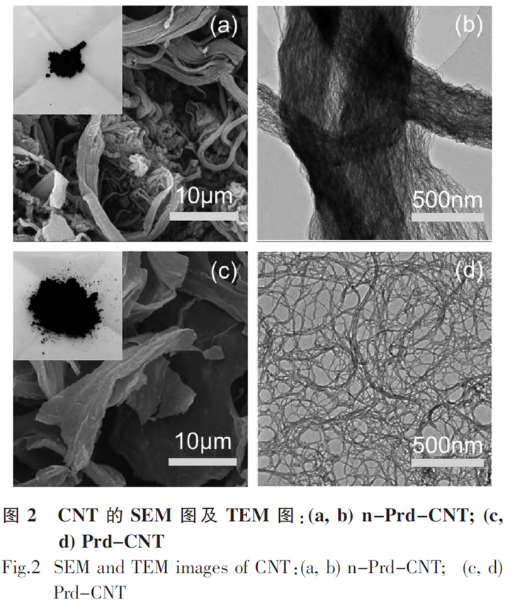 2.1 CNT 的微觀結(jié)構(gòu)CNT的微觀形貌如圖2,從低倍率SEM 圖可以看出(圖2(a)),n-Prd-CNT呈現(xiàn)嚴(yán)重纏繞且雜亂無序的團(tuán)簇狀。此外,從高倍率TEM 圖可以看出(圖2(b)),n-Prd-CNT為結(jié)構(gòu)緊密且寬窄不一的條帶狀。圖2(a)和2(c)左上角小圖為質(zhì)量為0.1g時(shí)n-Prd-CNT與Prd-CNT的粉體,可以看出經(jīng)過預(yù)分散處理后,相同質(zhì)量下CNT體積明顯變大。這是因?yàn)楦邏壕|(zhì)機(jī)以湍流分散[30]的方式打開了CNT的大尺寸團(tuán)聚,同時(shí)分散液中的分散劑PVP包覆在CNT 表面,阻止了CNT的再次團(tuán)聚,經(jīng)過冷凍干燥及高溫處理后, 在低倍率SEM 圖中可以看到Prd-CNT為疏松的片層結(jié)構(gòu)(圖2(c))。在高倍率的TEM 觀察下(圖2(d)),Prd-CNT網(wǎng)絡(luò)疏松,管間團(tuán)聚現(xiàn)象得到了明顯地改善。
