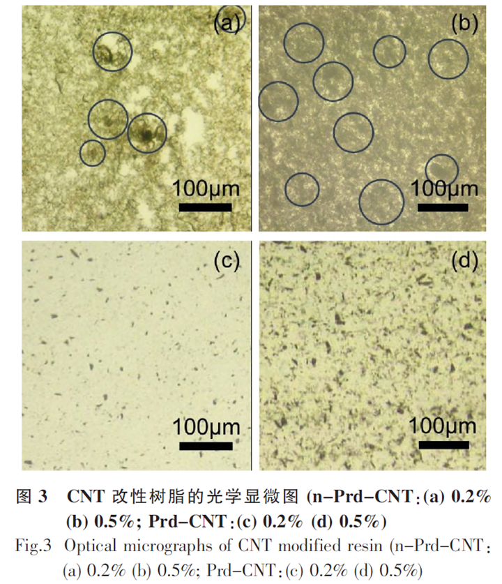 2.3 CNT改性樹脂澆鑄體的力學(xué)性能CNT改性樹脂澆鑄體試樣邊緣處對(duì)比如圖5所示,對(duì)于質(zhì)量分?jǐn)?shù)為0.1%的n-Prd-CNT 改性樹脂澆鑄體(圖5(a)),在邊緣處可以明顯看到CNT向內(nèi)部團(tuán)聚,能夠直接觀察到邊緣區(qū)域的CNT 分布不均勻。對(duì)于相同含量的Prd-CNT 改性樹脂澆鑄體(圖5(c)),邊緣處的顏色均勻。CNT改性樹脂澆鑄體固化時(shí),在樹脂凝膠前,溫度的提高會(huì)使CNT受熱運(yùn)動(dòng)發(fā)生再團(tuán)聚以及沉降。而預(yù)分散處理有效地改善了CNT在樹脂中的分散性,提高了CNT在樹脂升溫固化階段的穩(wěn)定性。