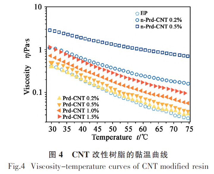 目前,廣泛使用的復(fù)合材料液態(tài)成型技術(shù),如RTM成型。一般要求樹脂黏度在工藝過程中小于1.0 Pa·s,而CNT的引入會(huì)導(dǎo)致樹脂基體的黏度大幅度上升[32-33],使樹脂對(duì)纖維的浸潤(rùn)性降低,制品的孔隙率增加,同時(shí)在工藝過程中需提高樹脂的注射壓力進(jìn)而影響模具的使用壽命,極大地限制了CNT改性樹脂在復(fù)合材料的制備加工領(lǐng)域的應(yīng)用。本工作制備的CNT改性樹脂的黏溫曲線如圖4,當(dāng)樹脂中n-Prd-CNT 質(zhì)量分?jǐn)?shù)為0.5%時(shí), 室溫下樹脂的黏度高達(dá)2.8 Pa·s,較純樹脂的黏度(0.4 Pa·s)有大幅度的提高,嚴(yán)重影響了n-Prd-CNT改性樹脂在室溫下應(yīng)用的加工工藝性能。與n-Prd-CNT改性樹脂相比,質(zhì)量分?jǐn)?shù)為0.2%的Prd-CNT改性樹脂的黏度大幅下降,基本與純樹脂相當(dāng)。此外,當(dāng)Prd-CNT改性樹脂中CNT質(zhì)量分?jǐn)?shù)為1.5%時(shí), 室溫下樹脂的黏度僅為1.1 Pa·s,幾乎與0.2%的n-Prd-CNT 改性樹脂的黏度一致,且在升溫的情況下樹脂的黏度明顯低于后者。證明了經(jīng)過預(yù)分散處理的CNT對(duì)環(huán)氧樹脂黏度影響較低,可應(yīng)用于制備高添加量低黏度的CNT改性樹脂復(fù)合材料中。