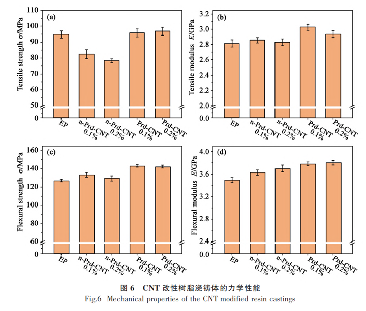 n-Prd-CNT 和Prd-CNT 改性樹脂澆鑄體的拉伸及彎曲性能如圖6。對(duì)于n-Prd-CNT改性樹脂澆鑄體,當(dāng)n-Prd-CNT 的質(zhì)量分?jǐn)?shù)為0.2%時(shí),澆鑄體的拉伸強(qiáng)度為78.4 MPa,較純樹脂澆鑄體的拉伸強(qiáng)度(94.7 MPa)下降了17.2%。主要原因是CNT通過三輥分散到樹脂中時(shí),輥間距最小為5 μm,對(duì)CNT施加的剪切力無法克服管間的范德華力,樹脂中的CNT 仍舊存在大量的團(tuán)聚,此結(jié)果與圖3(a)和3(b)一致。此外,由于CNT在樹脂固化階段發(fā)生的再團(tuán)聚造成了更多的應(yīng)力集中,導(dǎo)致隨著CNT含量的增加,n-Prd-CNT改性樹脂澆鑄體的力學(xué)性能變差。與n-Prd-CNT改性樹脂澆鑄體相比,Prd-CNT改性樹脂澆鑄體的拉伸性能有明顯地提高。另外,當(dāng)Prd-CNT的質(zhì)量分?jǐn)?shù)為0.2%時(shí),澆鑄體的彎曲強(qiáng)度與彎曲模量分別為145.1 MPa和3.9 GPa,較純樹脂澆鑄體的彎曲強(qiáng)度(127.3 MPa)和彎曲模量(3.5 GPa)分別提高了14.0%和11.4%。由于本工作選取的基體樹脂屬于高性能環(huán)氧樹脂, 基體自身的強(qiáng)度高,而樹脂中CNT的含量較低,受力時(shí)無法形成完整的應(yīng)力傳遞網(wǎng)絡(luò),所以CNT對(duì)樹脂的強(qiáng)度提升有限。