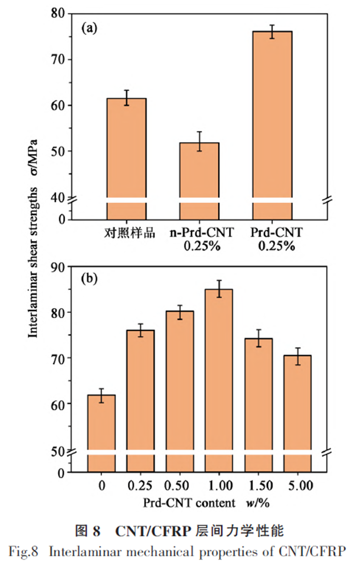 2.4 CNT/CFRP 的層間性能添加n-Prd-CNT和Prd-CNT制備CNT/CFRP的層間剪切性能如圖8。在復(fù)合材料整體受力破壞時(shí),CNT 能夠傳遞載荷,阻礙裂紋的擴(kuò)展,從而改善CNT/CFRP的力學(xué)性能[36]。對(duì)于n-Prd-CNT/CFRP,CNT 質(zhì)量分?jǐn)?shù)為0.25%時(shí), 復(fù)合材料的層間剪切強(qiáng)度為52.1 MPa, 較對(duì)照樣品的層間剪切強(qiáng)度(61.7MPa)降低了15.6%。對(duì)于Prd-CNT/CFRP,在CNT質(zhì)量分?jǐn)?shù)同為0.25%時(shí), 復(fù)合材料的層間剪切強(qiáng)度提高到76.0 MPa。復(fù)合材料的層間剪切強(qiáng)度隨Prd-CNT 含量的增加呈現(xiàn)先升高后降低的趨勢(shì)(圖8(b)),在質(zhì)量分?jǐn)?shù)為1.00%時(shí),復(fù)合材料的層間剪切強(qiáng)度達(dá)到了最高值85.1 MPa,較對(duì)照樣品的層間剪切強(qiáng)度提高了37.9%。