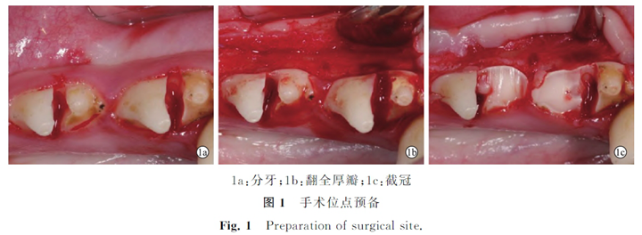 術(shù)前準(zhǔn)備:術(shù)前5d對(duì)實(shí)驗(yàn)動(dòng)物行CBCT檢查及齦上潔治術(shù)。實(shí)驗(yàn)動(dòng)物術(shù)前12h禁食禁水。麻醉:按0.1mL/kg體重于比格犬后肢內(nèi)側(cè)肌注鹽酸塞拉嗪(速眠新Ⅱ,吉林省敦化市圣達(dá)動(dòng)物藥品有限公司)與3%戊巴比妥鈉溶液(1mL/kg)進(jìn)行全身麻醉。術(shù)中密切觀察,若蘇醒,則使用速眠新初始用量的1/2進(jìn)行補(bǔ)充麻醉。待麻藥起效后,固定動(dòng)物,使用1%碘伏進(jìn)行口內(nèi)消毒,鹽酸腎上腺素阿替卡因注射液(必蘭公司,法國(guó))自第3前磨牙(P3)近中至第4前磨牙(P4)遠(yuǎn)中行局部浸潤(rùn)麻醉。分牙、翻瓣、截冠:用高速手機(jī)及金剛砂車針將P3、P4的近遠(yuǎn)中牙冠分開(kāi)(圖1a),自P3近中至P4遠(yuǎn)中作齦溝切口,翻全厚瓣(圖1b),依據(jù)術(shù)前CBCT分析各位點(diǎn)牙槽骨量,略高于牙槽嵴磨除遠(yuǎn)中或近中牙冠,作為手術(shù)位點(diǎn)(圖1c)。