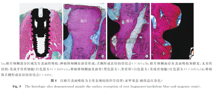 在骨結(jié)合期間,首先應(yīng)考慮到可能來(lái)自于根片-種植體界面、根片-頰側(cè)牙槽骨界面的不良反應(yīng)的風(fēng)險(xiǎn)。在本實(shí)驗(yàn)中,無(wú)論是根片發(fā)生替代性吸收還是表面吸收,根片-種植體界面均有新骨形成,雖然該界面的部分區(qū)域均有纖維結(jié)締組織,但并不影響種植體的穩(wěn)定性,傳統(tǒng)盾構(gòu)術(shù)亦顯示該界面存在健康的纖維結(jié)締組織[2]。在傳統(tǒng)盾構(gòu)術(shù)中,根片頰側(cè)借生理性牙周膜附著于頰側(cè)牙槽骨[11,12]。在本實(shí)驗(yàn)中,我們觀察到根片-頰側(cè)牙槽骨界面出現(xiàn)了表面吸收和替代性吸收兩種情況。實(shí)驗(yàn)中為固定根片,我們有意將種植體與根片部分區(qū)域直接接觸,種植體植入過(guò)程中對(duì)根片的壓力過(guò)大或損傷根表面是可能導(dǎo)致表面吸收的原因[13,14]。但表面吸收是一種有效愈合,根面將會(huì)由鄰近完整的牙周膜所修復(fù),預(yù)后良好,因此該吸收類型不會(huì)造成不良影響[15]。當(dāng)牙周膜大范圍損傷時(shí),根面活細(xì)胞缺乏,此時(shí)會(huì)誘導(dǎo)快速成骨的愈合過(guò)程,形成骨性粘連[16]。當(dāng)對(duì)粘連牙進(jìn)行截冠并保留牙根,牙根會(huì)出現(xiàn)替代性吸收,牙槽骨因而維持原有輪廓,并在粘連牙根的冠方出現(xiàn)骨沉積,當(dāng)整個(gè)牙冠及牙髓腔全部被去除時(shí),粘連牙就可完全被骨組織所替代[17]。組織學(xué)結(jié)果觀察到根片頰側(cè)與牙槽骨形成粘連,兩者界限不清,發(fā)生了替代性吸收,并有新骨沉積在根片冠方。因此推測(cè),如果愈合周期延長(zhǎng),根片可能完全被健康的骨組織包圍,融為一體,從而同樣達(dá)到保存牙槽骨的效果[18]。