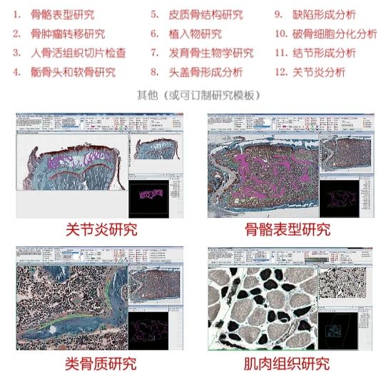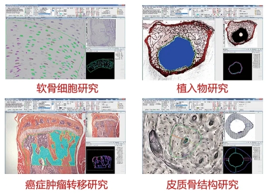使用OM骨形態(tài)計(jì)量系統(tǒng)或BQ骨生物學(xué)計(jì)量研究系統(tǒng),通過內(nèi)置計(jì)量學(xué)公式和分析模板進(jìn)行骨組織形態(tài)計(jì)量分析。廣泛應(yīng)用于解剖學(xué)、病理學(xué)、骨科學(xué)、口腔醫(yī)學(xué)、心腦血管、藥學(xué)、組織工程學(xué)、轉(zhuǎn)化醫(yī)學(xué)等基礎(chǔ)研究、臨床診斷、植介入材料與器械的生物相容性評(píng)價(jià)、法醫(yī)學(xué)、古生物學(xué)和古化石研究、脊椎類海洋生物研究等所有領(lǐng)域。可進(jìn)行定性/定量研究,包括基礎(chǔ)研究和臨床研究中所有的動(dòng)態(tài)指標(biāo)和靜態(tài)指標(biāo)都可直接計(jì)量獲取并分析。
